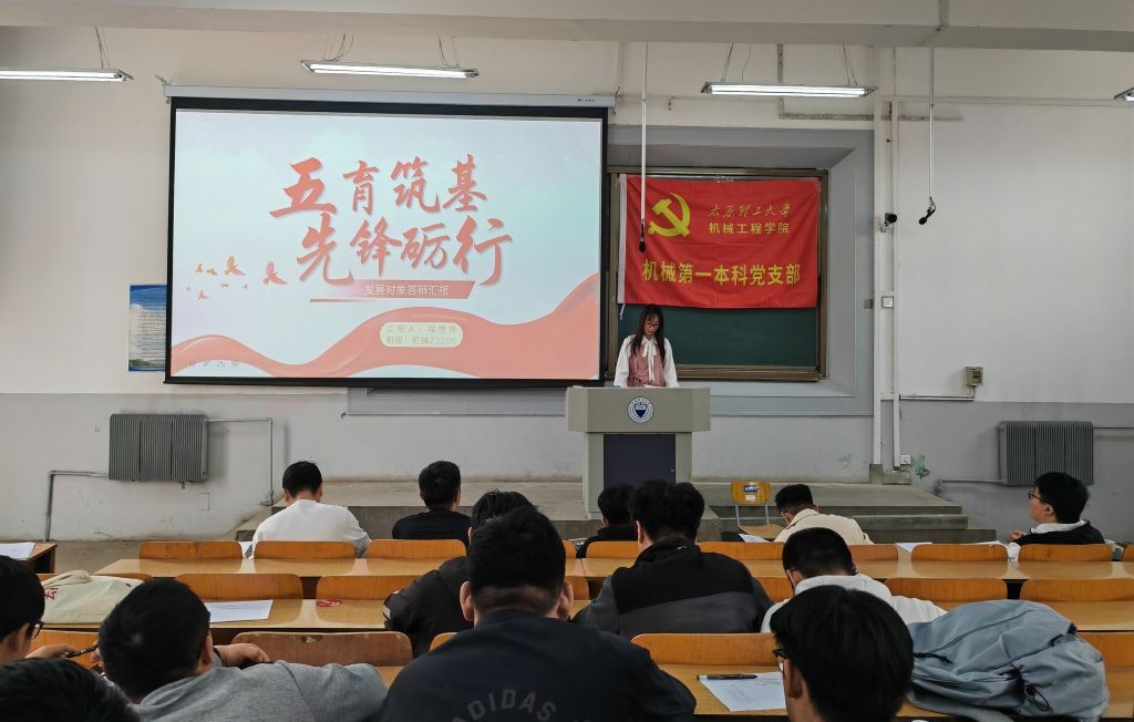 为检验入党积极分子学习成效,进一步推动党员发展工作规范化、制度化,机械第一本科党支部于2025年4月7日和4月9日组织召开入党积极分子“先锋亮绩·组织发展公开述评会”。支部书记杜卉、支部支委代表刘荣泰,兄弟支部惠敏强老师、支委王玮泽及辅导员代表刘晓东老师5名人员组成基层组织评审团,以及各班级36名同学组成师生群众评审团,对本季度入党积极分子政治理论学习考核合格的同学进行公开答辩评审。