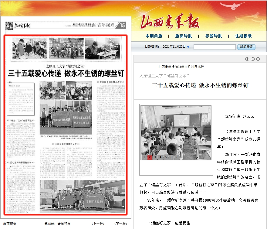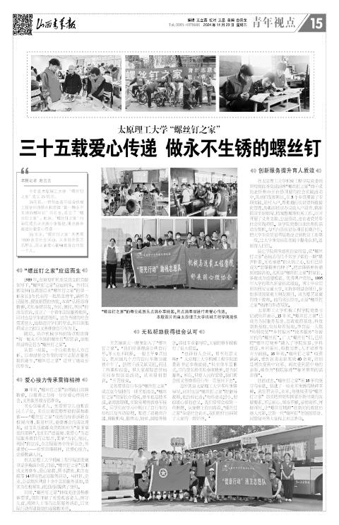 35年前,一群热血青年结合机械工程学科的特点和雷锋“做一颗永不生锈的螺丝钉”的名言,成立了“螺丝钉之家”。此后,“螺丝钉之家”的每位成员从点滴小事做起,用点滴奉献进行着爱心传递……